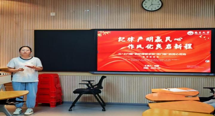 毛主席曾指出:“路线是‘王道’,纪律是‘霸道’,这两者都不可少。”毛颖同学以“纪律严明赢民心,作风优良启新程”为题,以“从‘上门板’的纪律要求到‘送门板’的民心所向”这一生动历史细节为线索,系统梳理了党的纪律建设与作风建设的历史传承与时代赓续,论证了“纪律严明聚民心、作风优良固江山”的核心观点。历史如此,今亦然之。这份对纪律作风的坚守,正是南昌大学践行中央八项规定精神、展现时代使命担当的集中体现。
