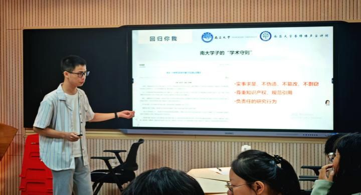 活动伊始,谢陈润泽同学围绕“科学道德与学风建设”,通过剖析典型学术不端案例,深入阐释了学术诚信的重要性,鼓舞同学们向学术界的典范与校园内的楷模学习,恪守“学术守则”,以严谨态度与诚信底线守护学术初心,助力国家科技发展与民族复兴。