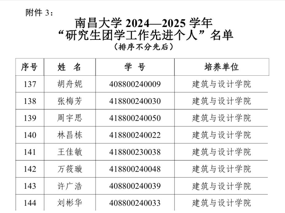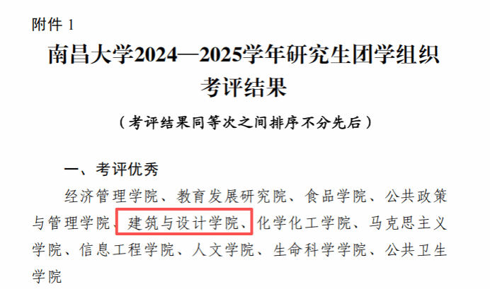 根据《关于公布南昌大学 2024—2025 学年研究生团学组织工作考核及评优结果的通知》(南大研工函〔2025〕32号),经各培养单位研究生团学组织申报、述职答辩、校研究生团学组织评审复核、党委研究生工作部审定,我院在本学年研究生团学组织考评中获评“优秀”。