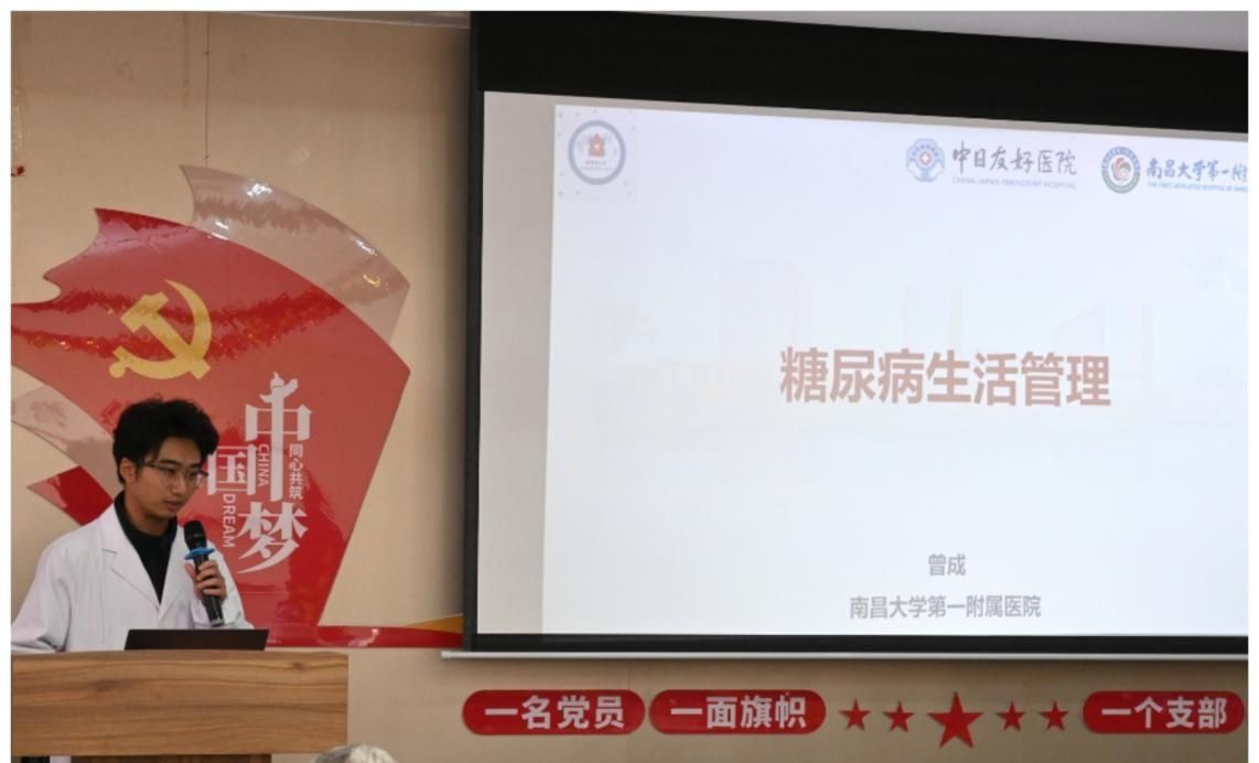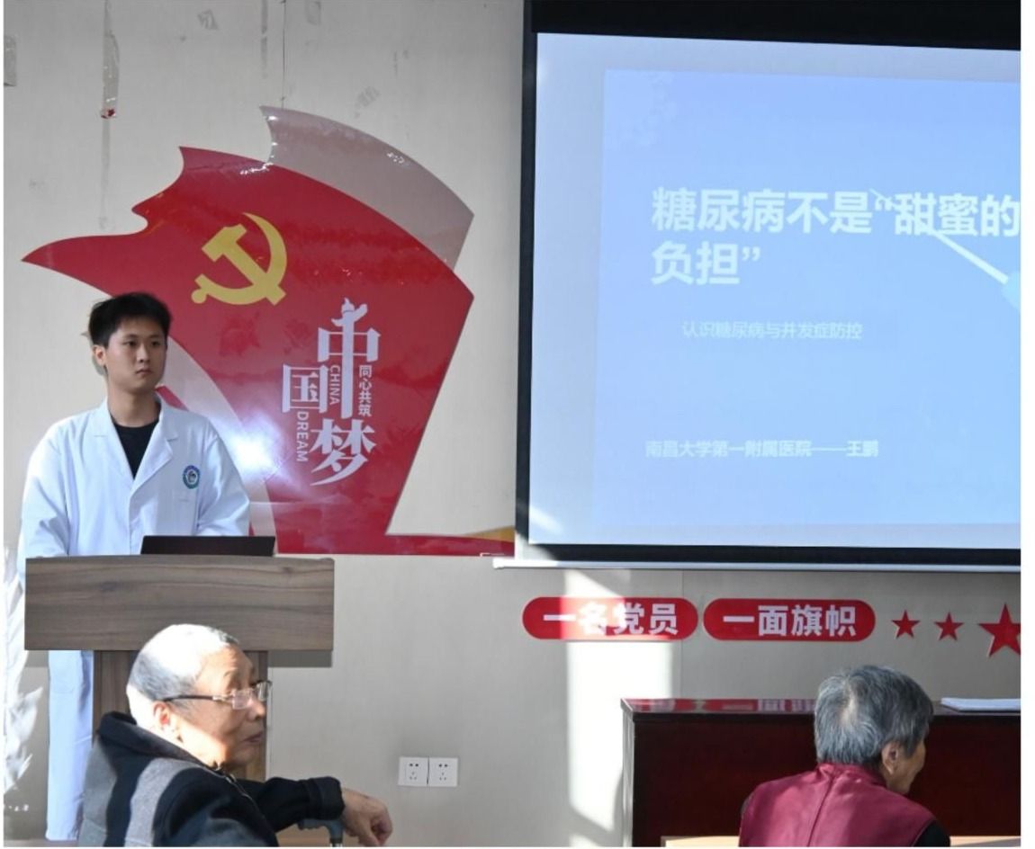 2025年11月14日世界糖尿病日当天,为积极响应“健康中国”行动号召,发挥专业优势服务社会,南昌大学第一临床医学院“一临博声”宣讲团联合学院研究生会,组织成员前往南昌天乐医养院,成功开展了以“关注血糖·守护健康”为主题的世界糖尿病日宣讲暨志愿服务活动。在此次活动中,宣讲团成员充分发挥专业特长,为老人们带来了精彩的健康科普,展现了青年医学生的责任与担当。
