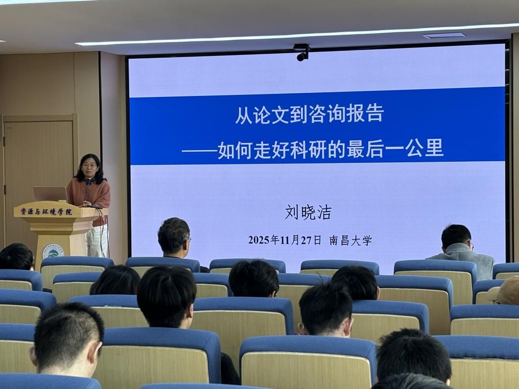 11月27日,南昌大学研究生“前湖‘研’讲”第16届导师讲坛第206期在环境楼彭峰报告厅举办。本次讲座特邀中国科学院地理科学与资源研究所资源利用与环境修复重点实验室副主任刘晓洁教授担任主讲,以“从论文到咨询报告——如何走好科研的最后一公里”为主题,旨在帮助研究生们明确“科研不止于写论文”,引导大家在选题阶段就兼顾理论深度与实际价值。