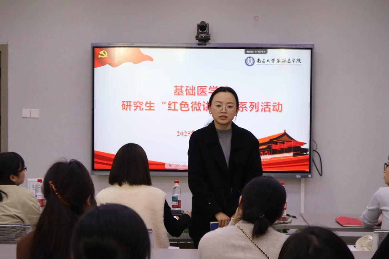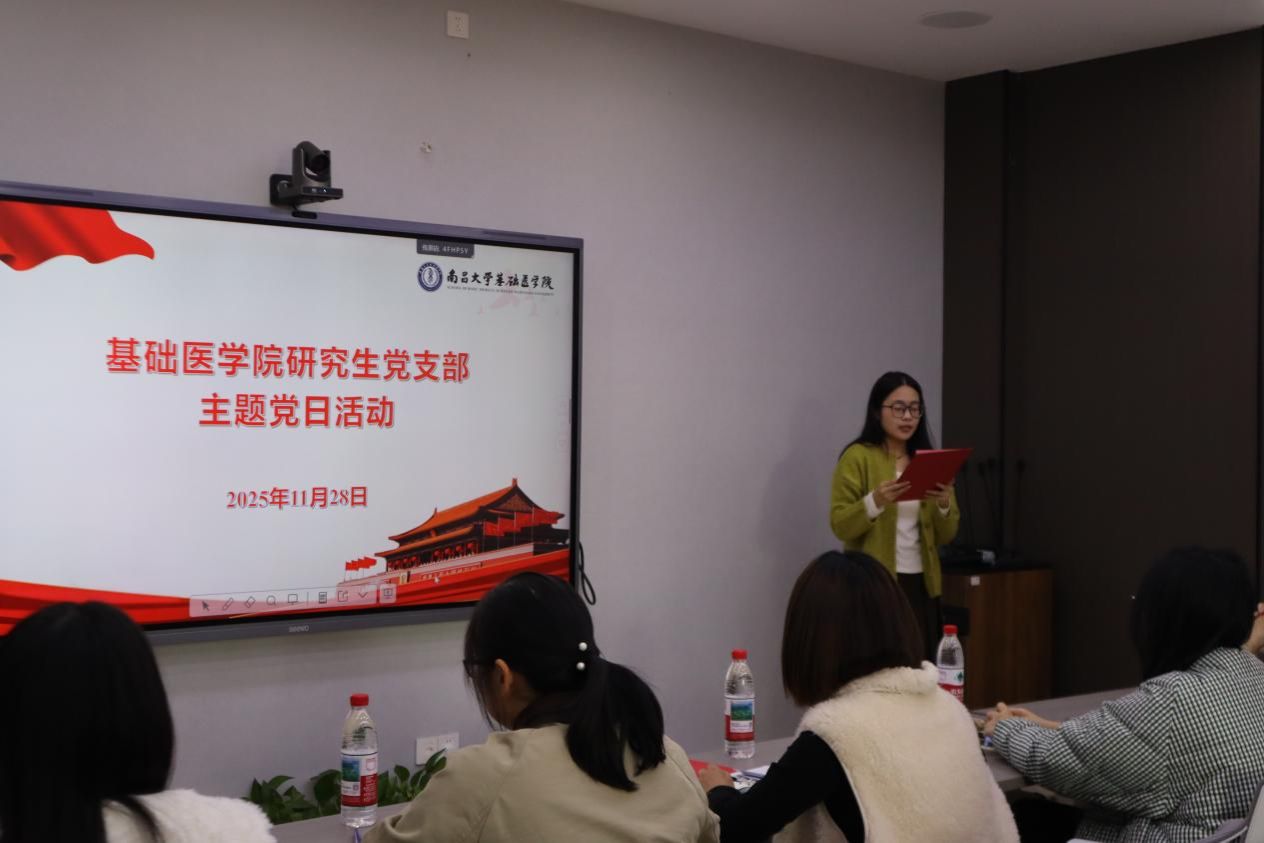 为进一步筑牢理论武装头脑,推动党的创新理论入脑入心、落地生根,基础医学院研究生党支部于11月28日下午,在前湖南院第二实验大楼201会议室开展主题党日活动,本次活动学院党委副书记兼纪检委员刘平、学院基础医学专业研究生党支部书记张秀玲、研究生辅导员李佳莉、研究生党支部支委和入党积极分子,共计25余人参加,会议由基础医学专业研究生党支部副书记史玉冰主持。