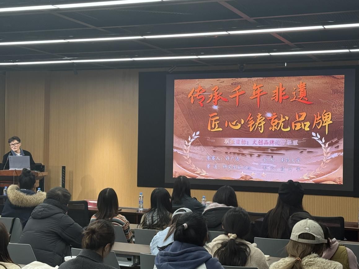 为助力研究生精准把握大学生职业规划大赛备赛关键,11月25日下午,第16届“前湖‘研’讲”之“南小研” 微讲堂(第 222 期)于艺术楼设计馆成功举办。本次活动特邀学院2024级设计学硕士研究生、南昌大学第二届职业规划大赛就业赛道金奖获得者许广浩担任主讲,南昌大学建筑与设计学院教授、博士生导师邱璟莅临指导。建筑与设计学院副院长周志仪、工业设计研究院副院长康信辉出席。