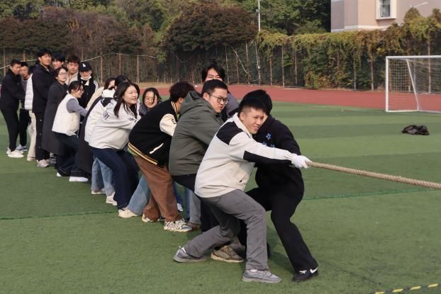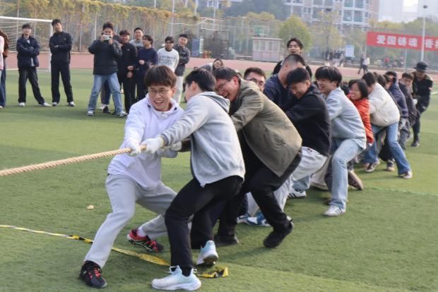 各参赛选手紧抓长绳,做好预备姿势,随着徐勇书记一声开赛令下,双方重心下移,双脚紧紧扎根地面,身体后倾成有力的弓形,长绳瞬间被拉成一条紧绷的直线,在场师生高喊出的助威声在运动场回响。从初赛的紧张对决到半决赛的胶着僵持,再到决赛的巅峰较量,每一支队伍都展现出极强的韧性。