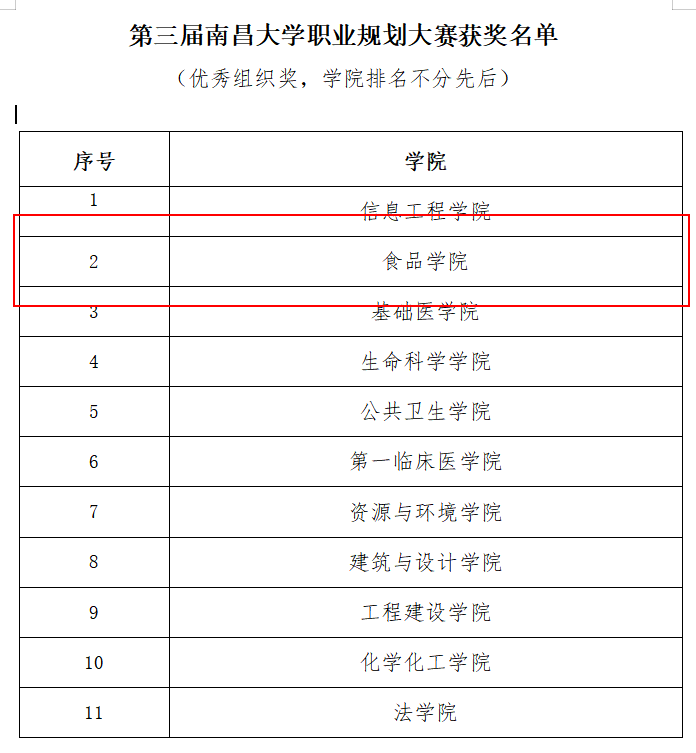根据《关于公布第三届南昌大学职业规划大赛获奖的通知》(南大招就函〔2025〕33号)公示结果,食品学院学子在本届大赛中表现优异,斩获多项荣誉。其中,就业赛道中,研究生韩嘉龙、邱毓荣获一等奖,黄雨琳、张宇荣获二等奖;在成长赛道中,本科生刘倩、白芮溪荣获二等奖,简安舟荣获三等奖,巫世钰荣获优秀奖。此外,李欣老师、陈赫老师获评“优秀指导老师”,食品学院荣获“优秀组织奖”。