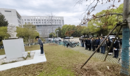 室内集中学习结束后,全体师生前往基础实验大楼石秋杰教授雕像前开展敬献仪式。两名党员代表庄重地将花束敬献于雕像前,全体师生肃立三鞠躬,默哀三分钟,以最诚挚的敬意寄托对石秋杰教授的深切缅怀。默哀毕,全体参与人员在雕像前合影留念,将这份对楷模的敬意、对精神的传承定格成永恒。