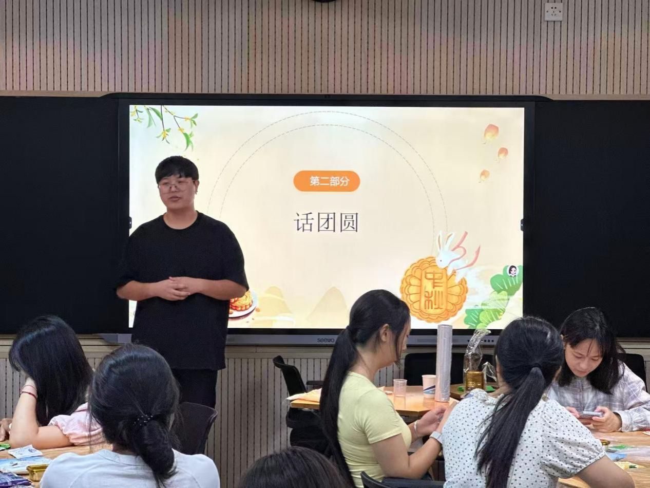活动伊始,主持人向在场学员介绍了中秋节的民俗渊源,解读其背后的文化意义,并特邀小组内“文化分享人”杜伊伦同学讲解月饼的发展演变史,介绍冰皮月饼的创新特色。杜伊伦以“月圆下的家与国”为切入点,引导学员思考“小家团圆”与“国家安宁”的深刻联系,进一步激发学员的责任意识与家国情怀。
