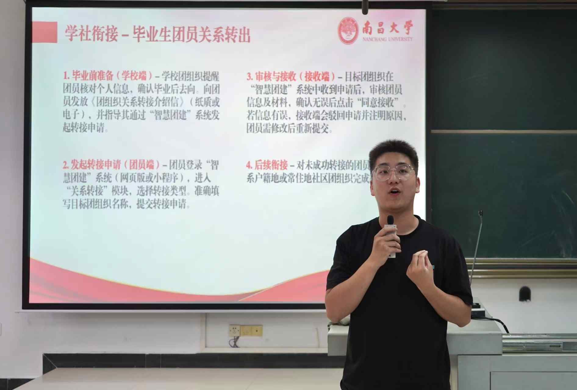 培训会上,研团委工作人员分别就基础团务工作和南昌大学“领航计划”研究生骨干培训班相关工作进行了系统讲解。聂仁杰同学从团组织关系转接、材料报送、团费缴纳、新团员发展等日常工作内容开展培训,并现场演示了主题团日活动的录入步骤,这能够帮助解决工作中普遍遇到的问题,有效提升团干的实务操作能力。胡宇泽同学向大家介绍了“领航计划”研究生骨干培训班的工作内容和意义,展示了培训班在落实立德树人根本任务方面的成就,并动员各基层培养单位团干积极配合后续工作,共同携手为赋能学生成长、助推学校高质量发展奠定坚实的人才基础。