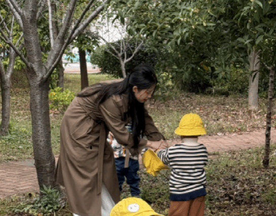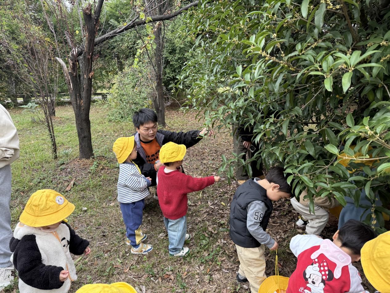 上午九点,志愿者们化身“临时家长”,牵着孩子们的小手登上宝宝巴士。一路上欢声笑语不断,孩子们好奇地张望窗外的秋日美景。抵达先啸园后,映入眼帘的是缀满枝头的金黄桂花,清甜的香气扑面而来。志愿者们耐心引导孩子们轻轻拾起飘落的桂花,教他们辨认花瓣的形状、触摸自然的肌理。小小的掌心里,盛满了秋日的馈赠,园中回荡着孩子们纯真的笑声。