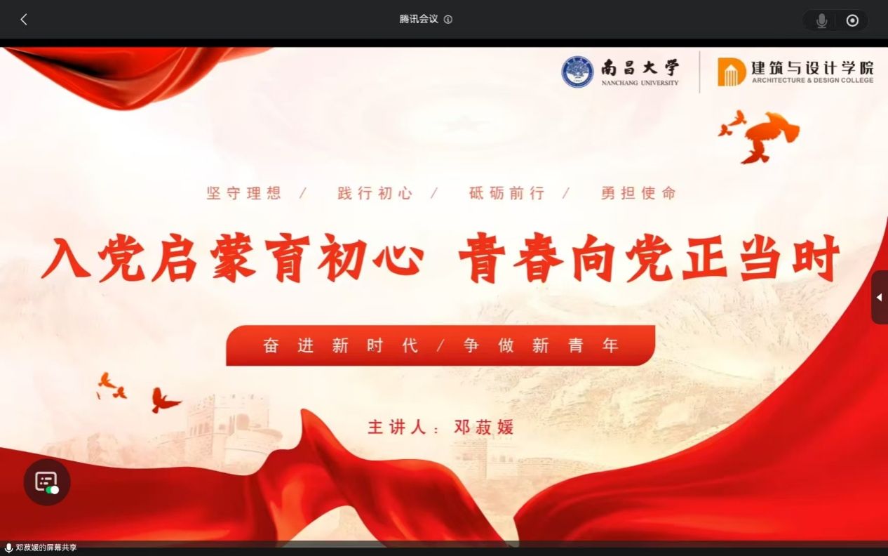 为引导青年学生坚定理想信念、积极向党组织靠拢,11月3日19点,建筑与设计学院承办了南昌大学前湖“研”讲第16届“南小研”微讲堂(第213期)。本次微讲堂由学院学术型研究生第一党支部副书记邓菽媛主讲,围绕“坚守理想、践行初心、砥砺前行、勇担使命”的核心精神,激励青年学子奋进新时代、争做新青年。