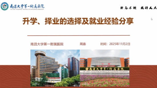 周凤师姐(就职于南昌大学第一附属医院)重点解析了一附院招聘的具体流程,包括报名时间节点、笔试与面试的形式及常见内容、日常专业知识的积累与面试表达的流畅性,在招聘过程中展现出积极向上的精神风貌与扎实的专业素养。