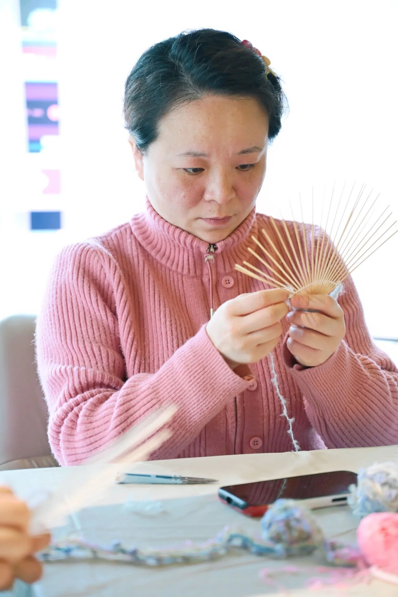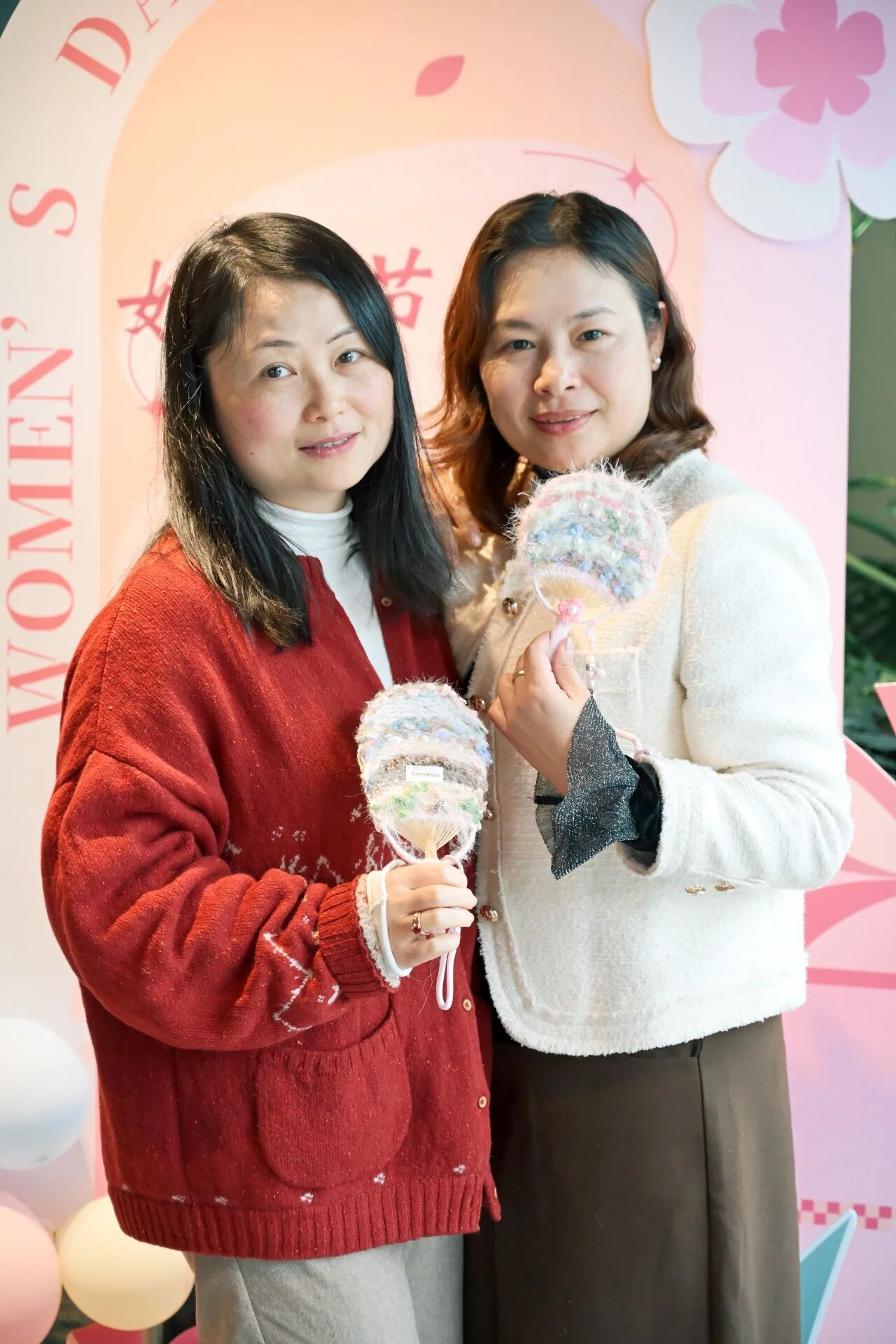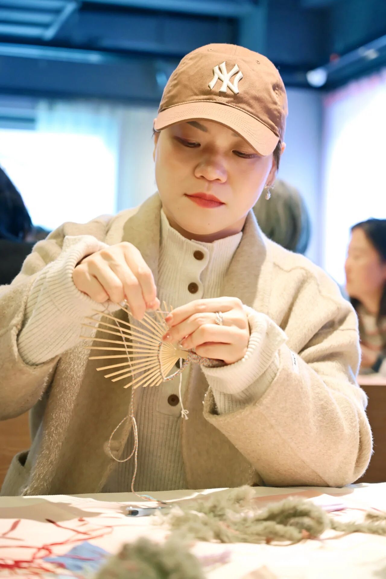 大家或低头专注编织,或轻声交流灵感,欢声笑语不断。绒线在指尖穿梭,流苏随风轻摇,字母串珠点缀其间……一把把素色的竹扇骨架,在女职工们的巧手下逐渐变得生动鲜活,仿佛被赋予了春天的气息。经过一个多小时的精心制作,一把把风格各异的竹扇惊艳亮相。有的清新淡雅,以素色绒线搭配简约流苏;有的活泼俏皮,用彩色串珠拼出名字或祝福;有的则充满古典韵味,织带与挂环相得益彰。每一把扇子都凝聚着创作者的巧思与情感,成为独一无二的“春日限定”。