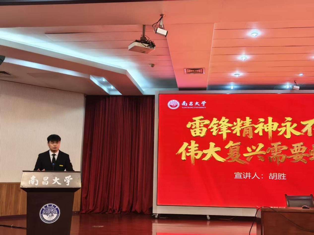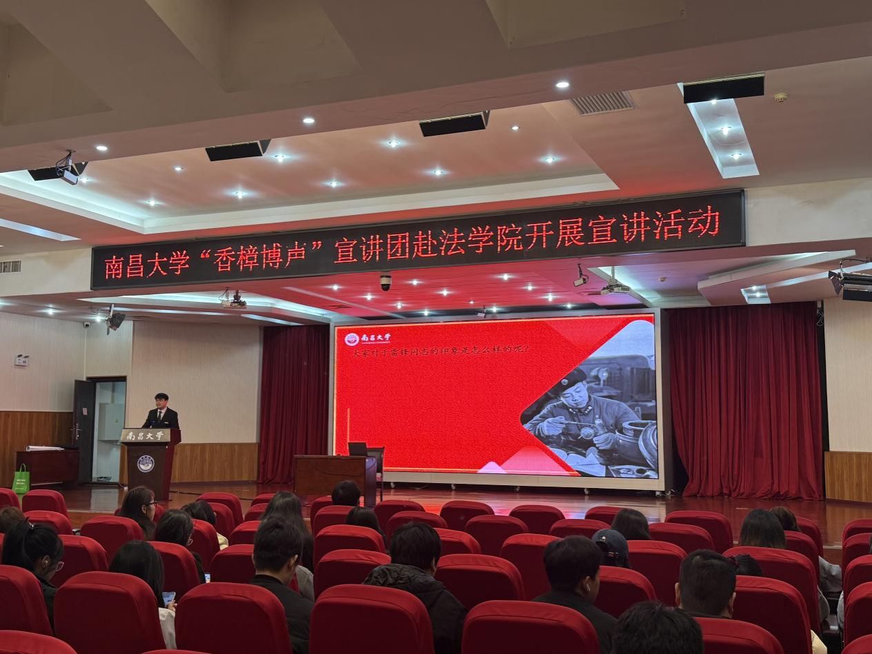 2026年3月17日下午,南昌大学第16届“前湖研讲”研究生学术文化节“南小研”微讲堂(第241期)在法学院模拟法庭开讲。本次微讲堂以“雷锋精神与两会精神解读”为主题,特邀南昌大学2024级硕士研究生、“香樟博声”宣讲团讲师、课程评议员胡胜登台宣讲。法学院2025级全体研究生到场聆听,活动旨在引导同学们深刻领会两大精神的时代内涵,助力研究生在青春赛道上踔厉奋发、勇毅前行。