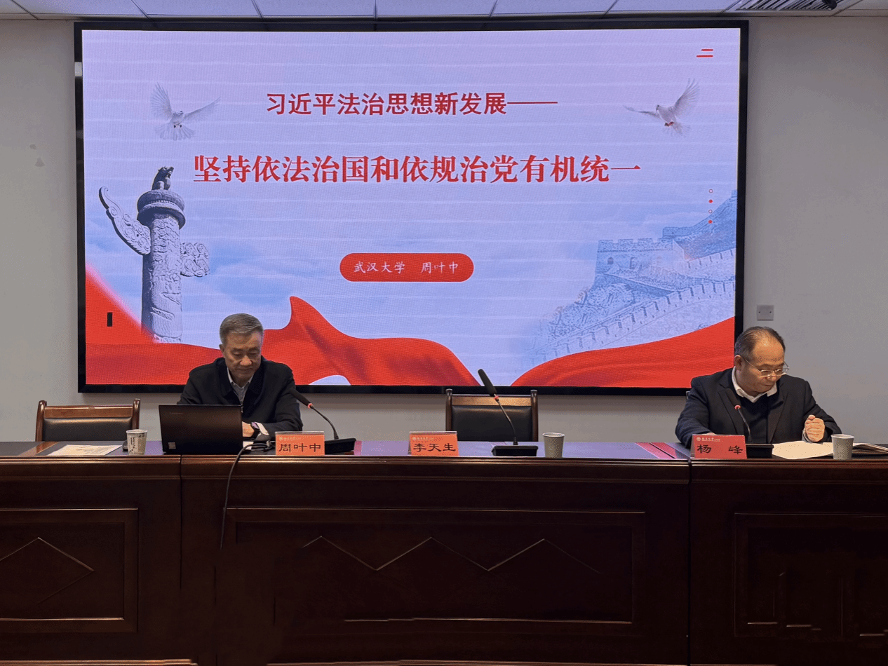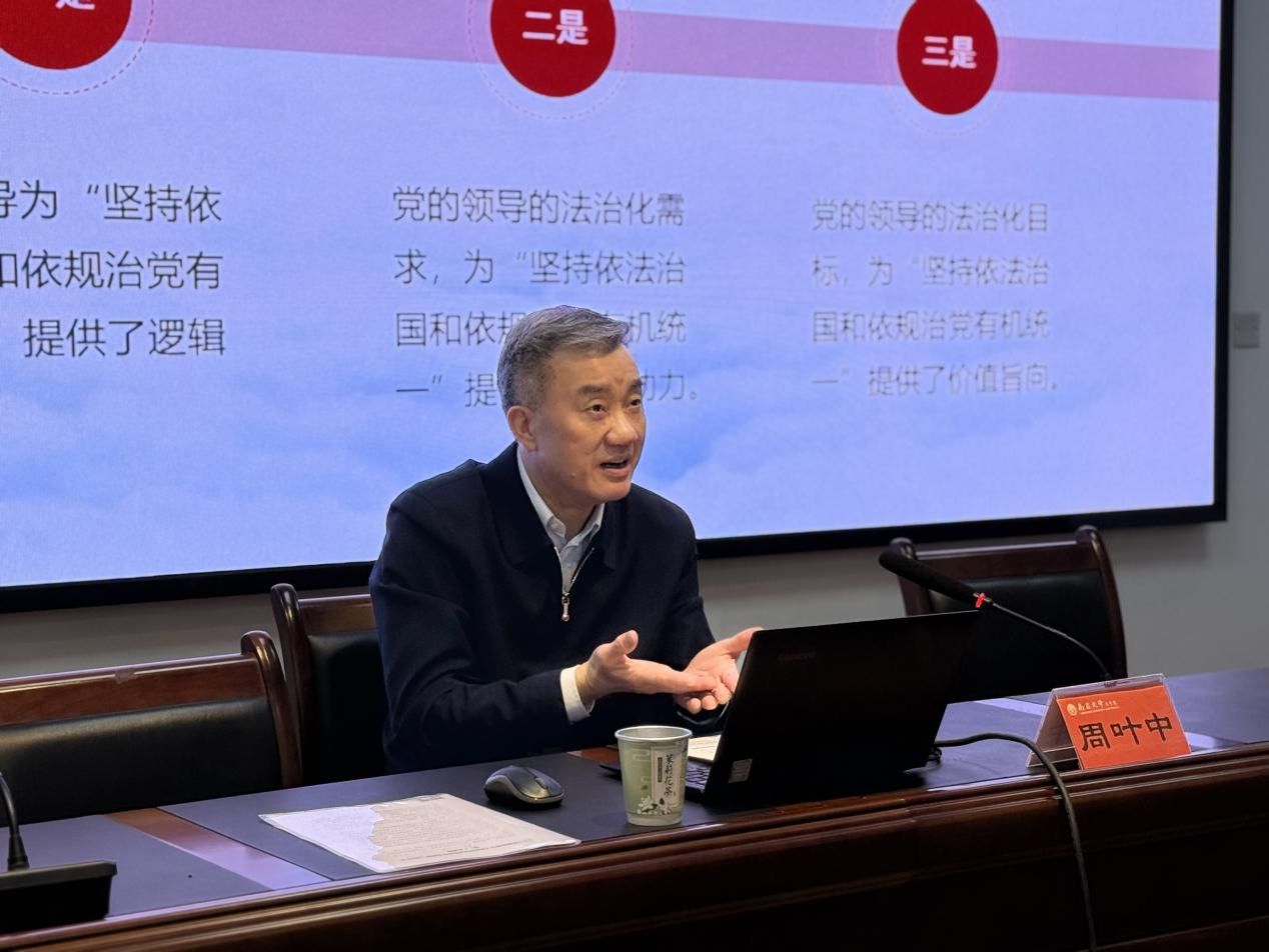 讲座伊始,周叶中教授便紧扣习近平法治思想的核心创新命题展开讲解,系统阐述了依法治国与依规治党有机统一的理论根基、核心要义、重大意义及实践要求。他指出,这一命题是中国特色法治的原创性贡献,源于我国党建国家的独特发展逻辑,是新时代治国理政体系与法治体系建设的必然要求。