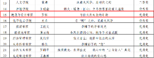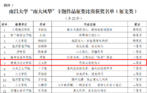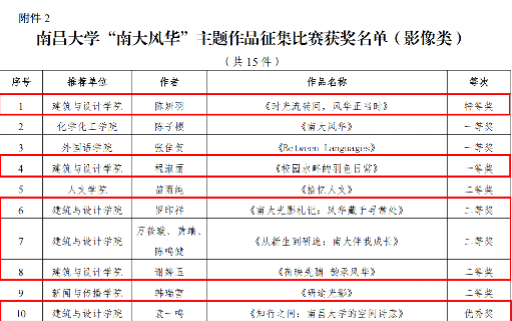 近日,根据《关于公布南昌大学“南大风华”主题作品征集比赛获奖名单的通知》(南大研工函〔2026〕6号),经专家评审、党委研究生工作部复核审定,建筑与设计学院在组织工作中表现突出,荣获“优秀组织奖”。