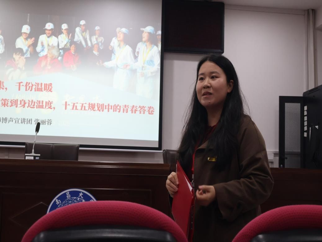 “十五五”规划纲要贯彻落实党的二十届四中全会精神,为未来5年中国经济社会发展绘就了清晰的施工图,提供了科学指引。为深入学习贯彻“十五五”规划精神,引导青年学子坚定理想信念,勇担时代重任,3月27日,南昌大学第16届“前湖研讲”研究生学术文化节第245期“南小研”微讲堂在文法楼A201圆满举行。活动邀请马克思主义学院2025级硕士研究生、“香樟博声”宣讲团讲师张丽蓉担任主讲人,她以“一本影集,千分温暖——从纸上政策到身边温度,十五五规划中的青春答卷”为主题给大家带来一场兼具理论高度和实践温度的深情分享。宣讲吸引了公共政策与管理学院50余位研究生参与,现场氛围热烈。