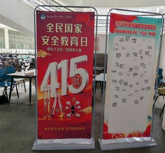 沉浸式科普,安全知识入脑入心。现场布置了醒目的主题宣传展架,红色展架上“全民国家安全教育日”“415”等字样醒目突出,融入化学实验仪器、分子结构模型等元素,直观展现化工领域与国家安全的紧密联系;同时设置签名寄语墙,同学们写下维护国家安全的承诺。活动围绕化学领域安全、科研数据保密、实验室规范、生态安全等内容,将专业知识与国家安全知识相结合,让同学们清晰地认识到化工科研和国家安全的内在关联。