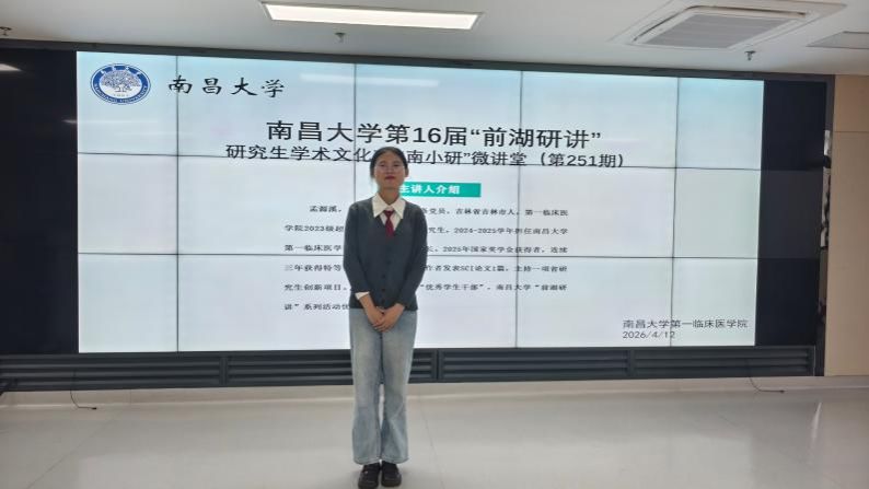 为进一步营造浓厚学术氛围,助力研究生拓宽科研视野、明晰发展方向,由南昌大学党委研究生工作部、南昌大学研究生会主办,南昌大学第一临床医学院研究生会承办的第十六届前湖“研”讲·国奖获得者经验分享会于2026 年4月12日在规培大楼701 室隆重举行。