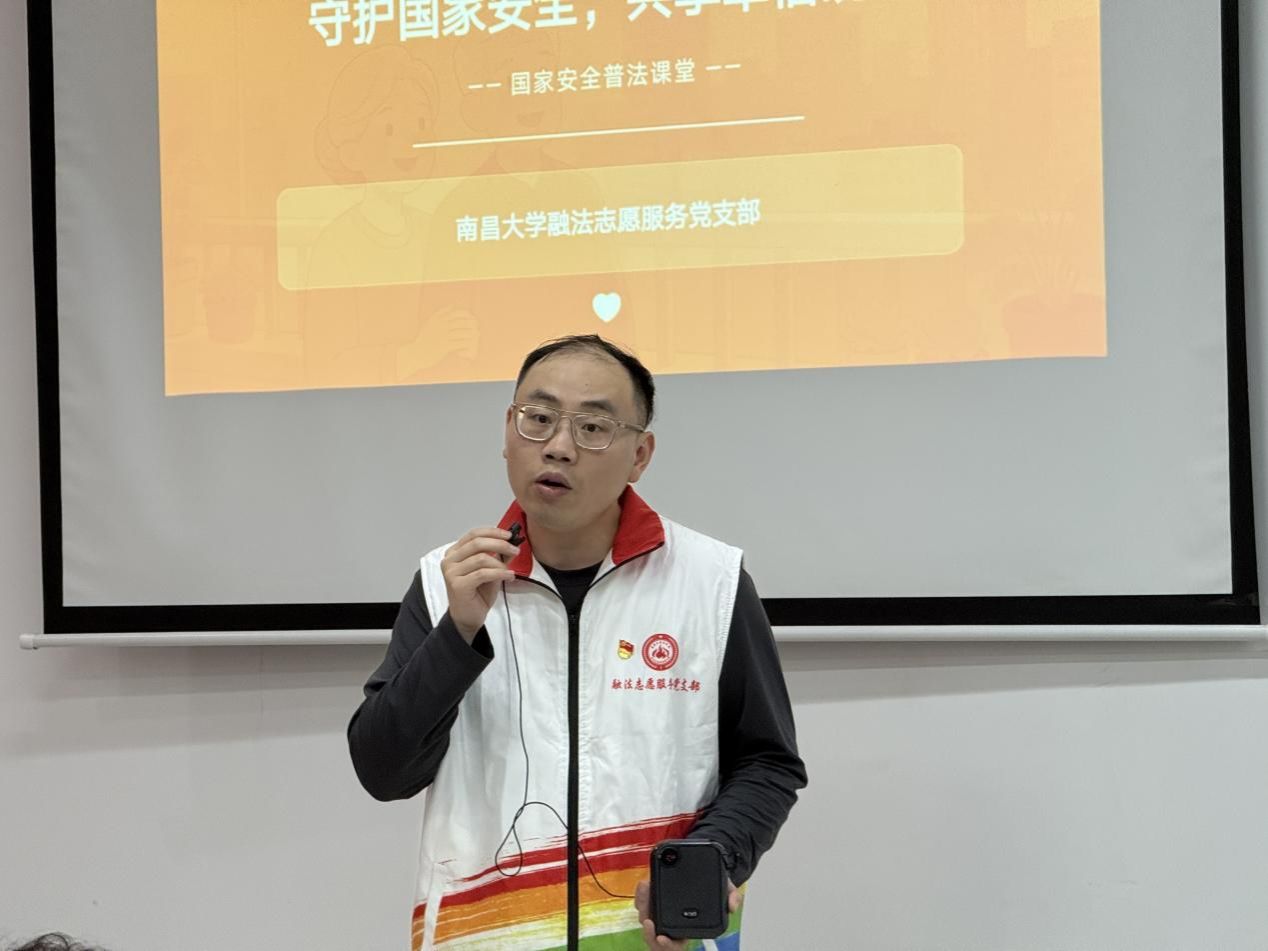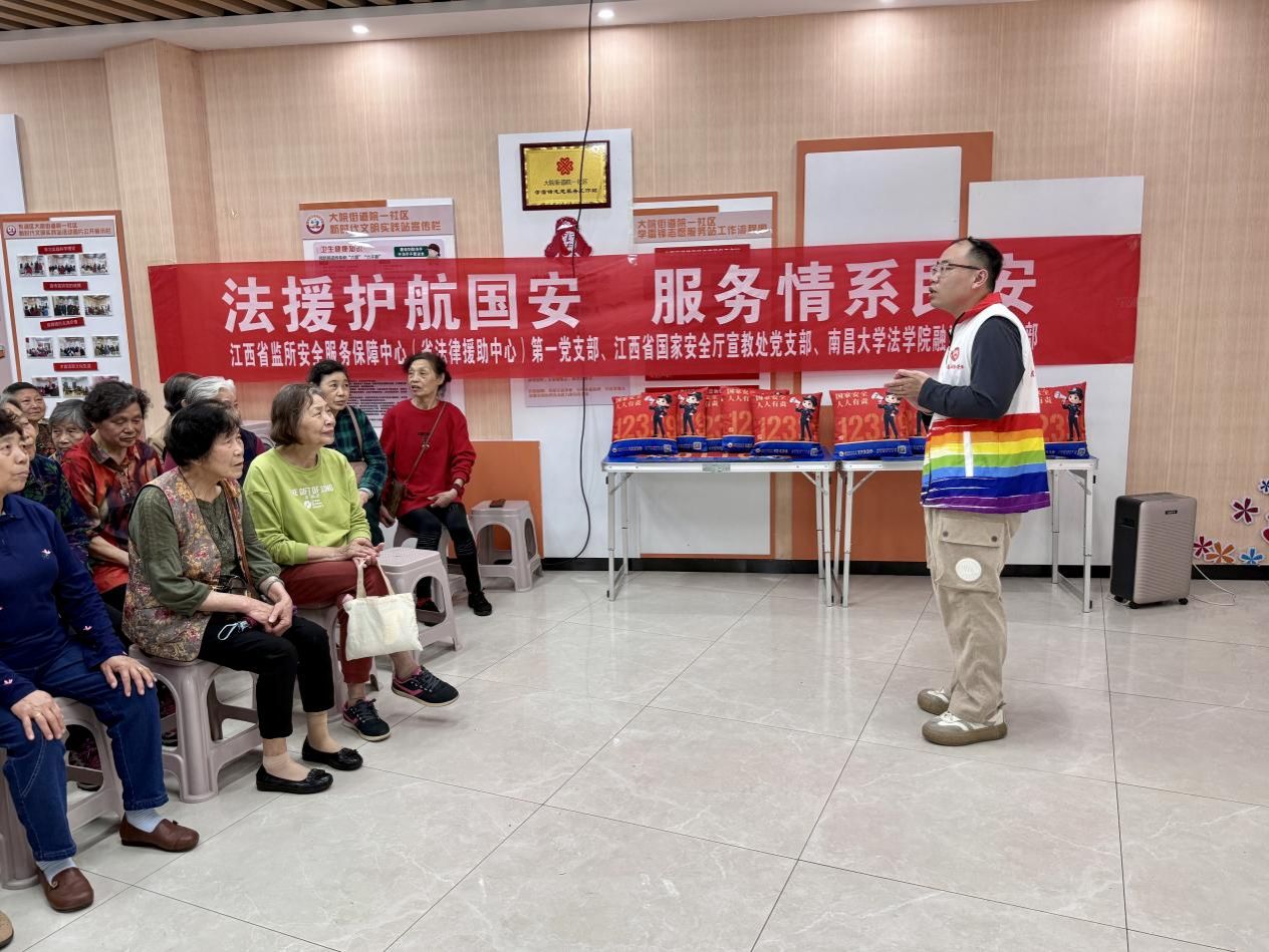 为深入学习贯彻总体国家安全观,增强社区居民国家安全意识和法治素养,2026年4月10日下午,南昌大学法学院融法志愿服务党支部走进江西省南昌市东湖区大院街道省府院内第一社区党群服务中心,联合江西省监所安全服务保障中心(省法律援助中心)第一党支部,共同开展以“法援护航国安 服务情系民安”为主题的国家安全普法宣传活动,以专业志愿服务践行法治为民初心。